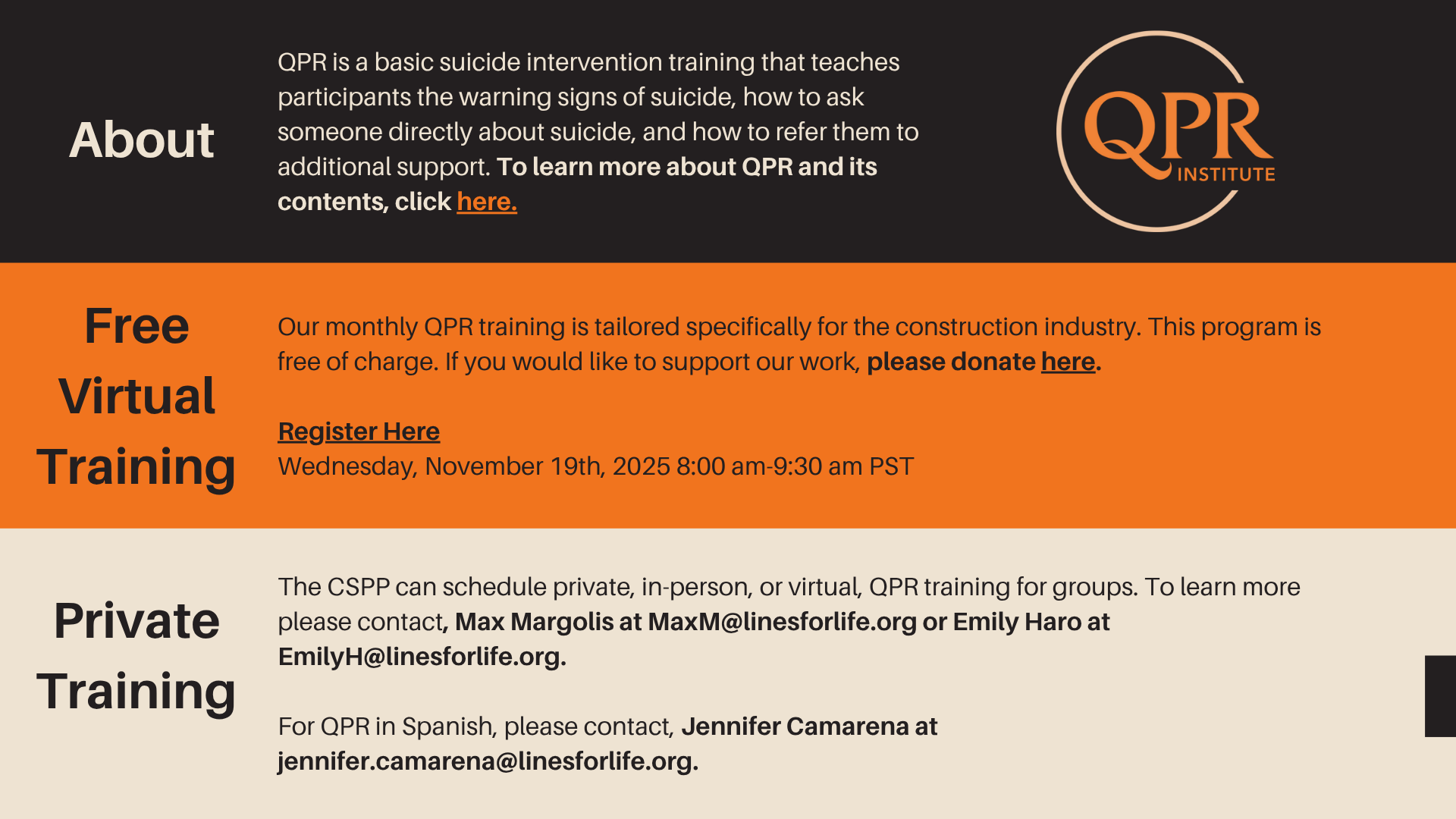 In response to the staggering rate of suicide deaths among construction industry workers, Lines For Life, a statewide non-profit dedicated to substance abuse and suicide prevention, partnered with the construction industry to form the Construction Suicide Prevention Project (CSPP).