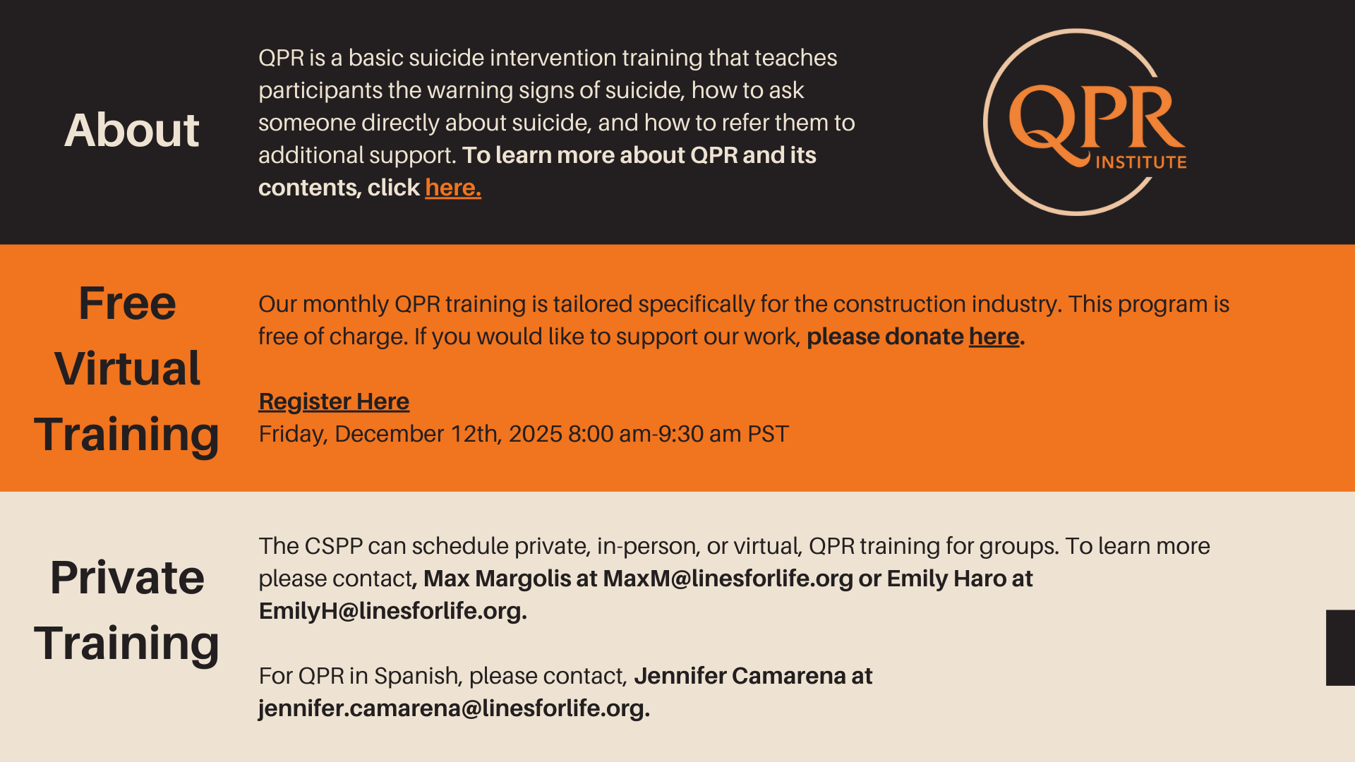 In response to the staggering rate of suicide deaths among construction industry workers, Lines For Life, a statewide non-profit dedicated to substance abuse and suicide prevention, partnered with the construction industry to form the Construction Suicide Prevention Project (CSPP).